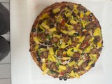 Pizza sauce, vegan cheese, vegan bacon, vegan ham, red onions, green peppers, cinnamon brown sugar pineapples & vegan cheddar.